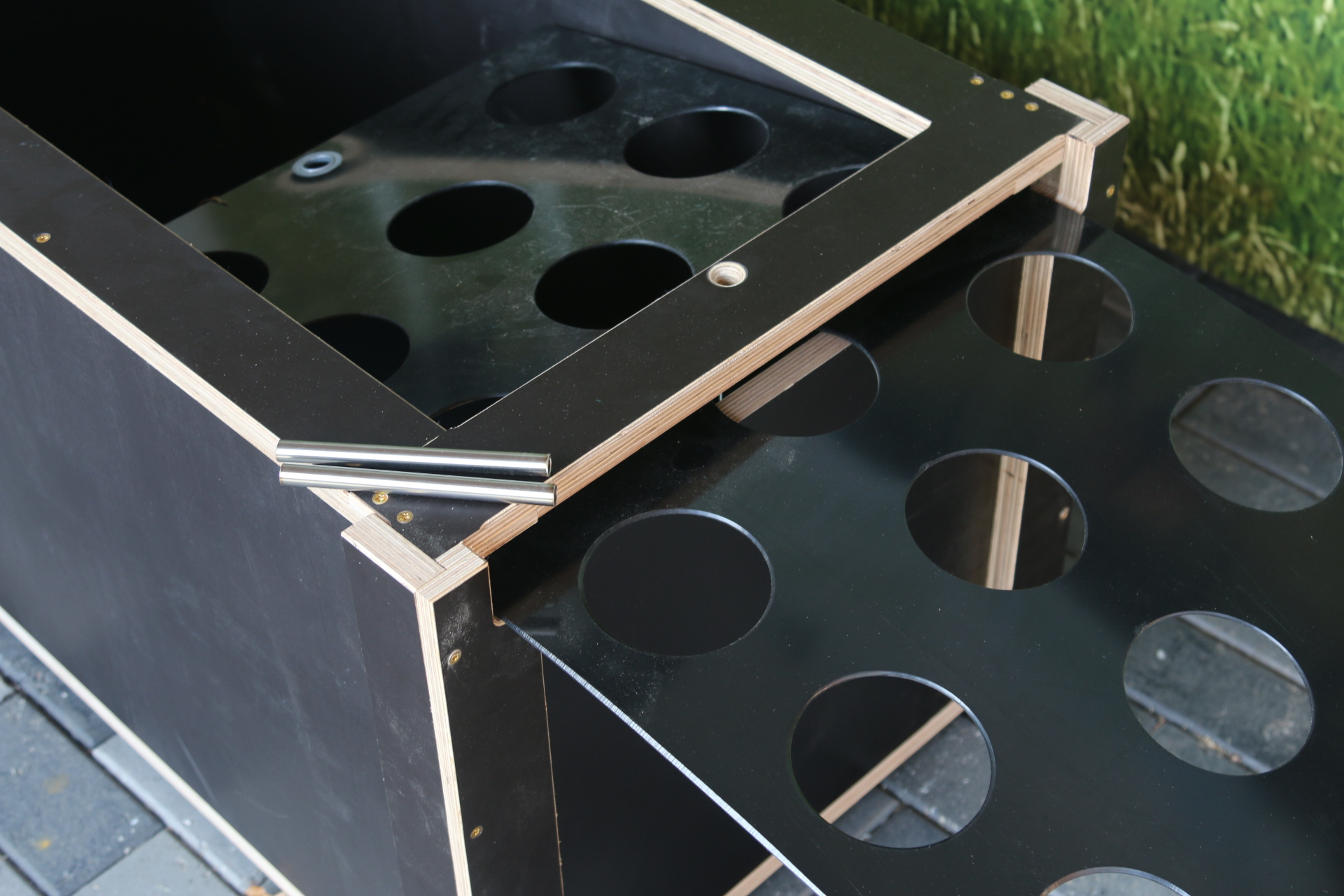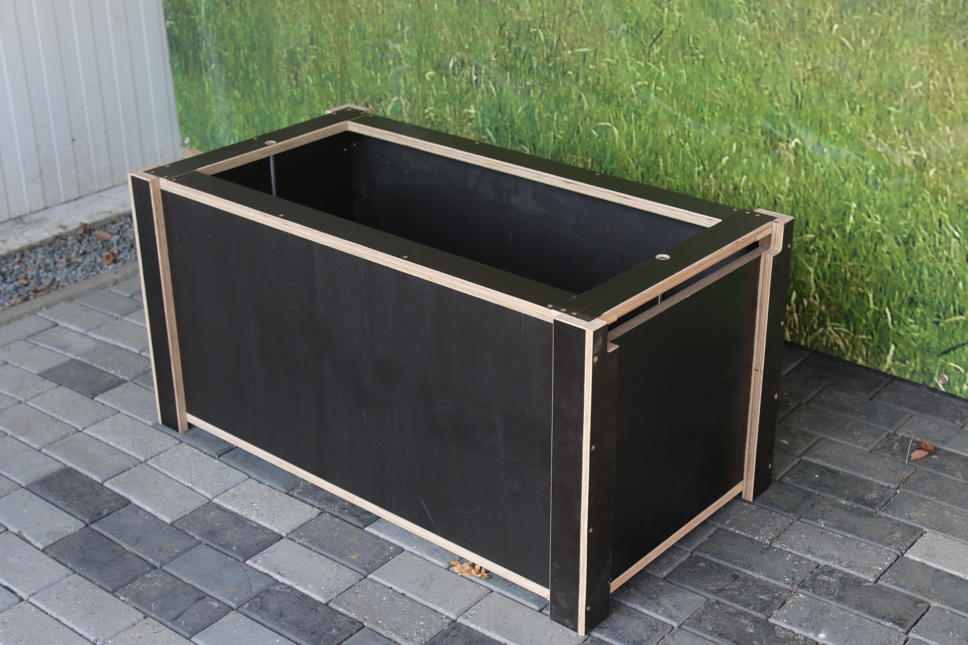 Die Kiste besteht aus einer Multiplexplatte ( Siebdruckplatte), dadurch ist sie sehr stabil und äußerst witterungsbeständig.